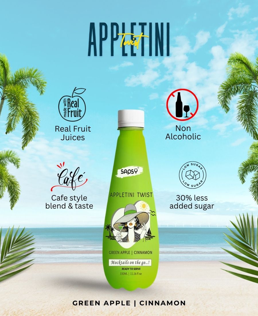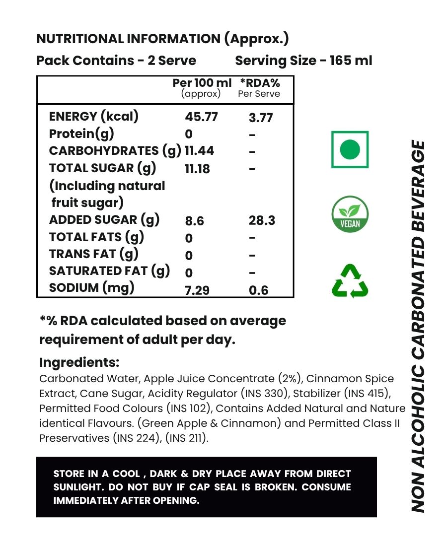 Carbonated Water, Apple Juice Concentrate (2%), Cinnamon Spice Extract, Cane Sugar, Acidity Regulator (INS 330), Stabilizer (INS 415), Permitted Food Colours (INS 102), Contains Added Natural and Nature identical Flavours. (Green Apple & Cinnamon) and Permitted Class II Preservatives (INS 224), (INS 211).